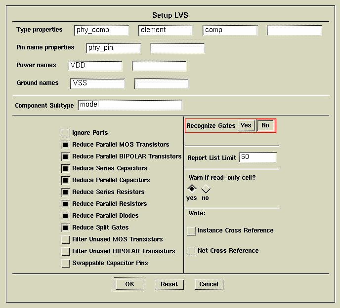 Σημ: Αν θέσετε το “Recognize Gates” σε “YES”, το LVS θα προσπαθήσει να συγχωνεύσει και συνδυάσει τα transistors σε λογικές πύλες στο layout σας. Αυτή η επιλογή πρέπει να ενεργοποιείται όταν το σχηματικό σας είναι σε gate level.