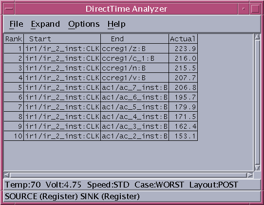 Στην συνέχεια βλέπουμε ένα παράδειγμα της εξόδου για δέκα δρόμους (paths), worst case, register to register :