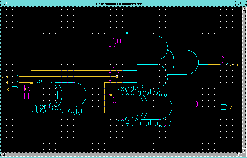 Τότε μπορούμε να δώσουμε αυτήν την εντολή στο UNIX prompt για να δούμε το παραγόμενο σχήμα. Για τον full adder θα δούμε κάτι σαν αυτό:
