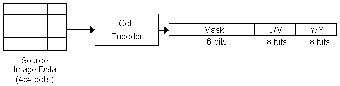 Η CellA δέχεται σαν είσοδο σήμα RGB, ενώ η CellB σήμα YUV. Το καθένα απαιτεί το εύρος και το ύψος της εικόνας διαιρεμένο σε τέσσερα κομμάτια. Η εικόνα που εισάγεται είναι χωρισμένη σε 4x4 ομάδες pixel που oνομάζονται cell. H τεχνική κωδικοποίησης του Cell βασίζεται σε μία μέθοδο που ονομάζεται Block Truncation Coding (BNC). Οι 16 κουκκίδες σε κάθε Cell έχουν κωδικοποιηθεί από μία 16bit μάσκα και δύο 8bit εντάσεις. Η CellA και η CellB διαφέρουν στον τρόπο της έντασης που διαλέχτηκε. Στη CellΑ οι τιμές είναι δείκτες σε έναν πίνακα χρωμάτων, ενώ στη CellB οι τιμές είναι δείκτες σε έναν πίνακα διανυσματικών ποσοτήτων.