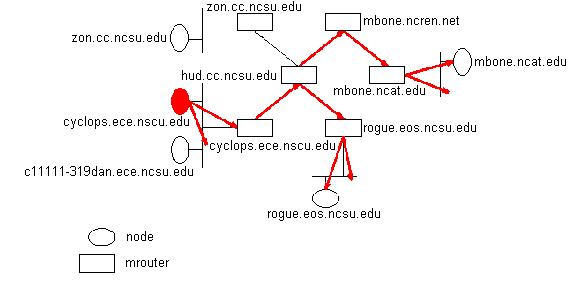 Σε παρεμβαλλόμενους routers και δίκτυα τα δεδομένα μοιάζουν με κανονικά unicast πακέτα. Η ακόλουθη εικόνα παρουσιάζει μία πιο ρεαλιστική εικόνα του τι ακριβώς συμβαίνει κατά την διάρκεια του multicast routing.